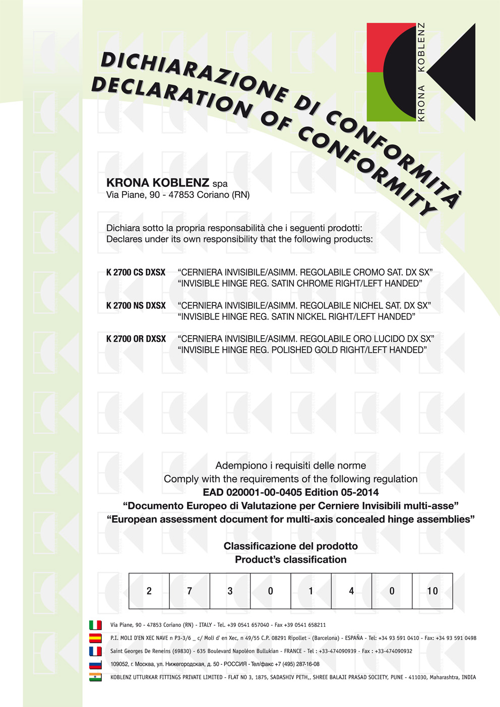 Koblenz to europejski producent zawiasów wpuszczanych z serii Atomika, Kubica, KuBi7 i Kubikina oraz nowoczesnych systemów drzwiowych. Poszczególne rozwiązania marki wyróżniają się wysoką jakością wykonania, funkcjonalnością oraz wytrzymałością, a ich właściwości potwierdzają certyfikaty instytutów badawczych. Celem Koblenz jest ciągłe rozwijanie linii oferowanych produktów. a także wprowadzanie na rynek nowości, odpowiadających aktualnie obowiązującym trendom oraz potrzebom klientów. Centrala przedsiębiorstwa znajduje się na terenie Włoch, ale posiada ono swoje przedstawicielstwa również w kilku innych krajach w Europie oraz w Azji.