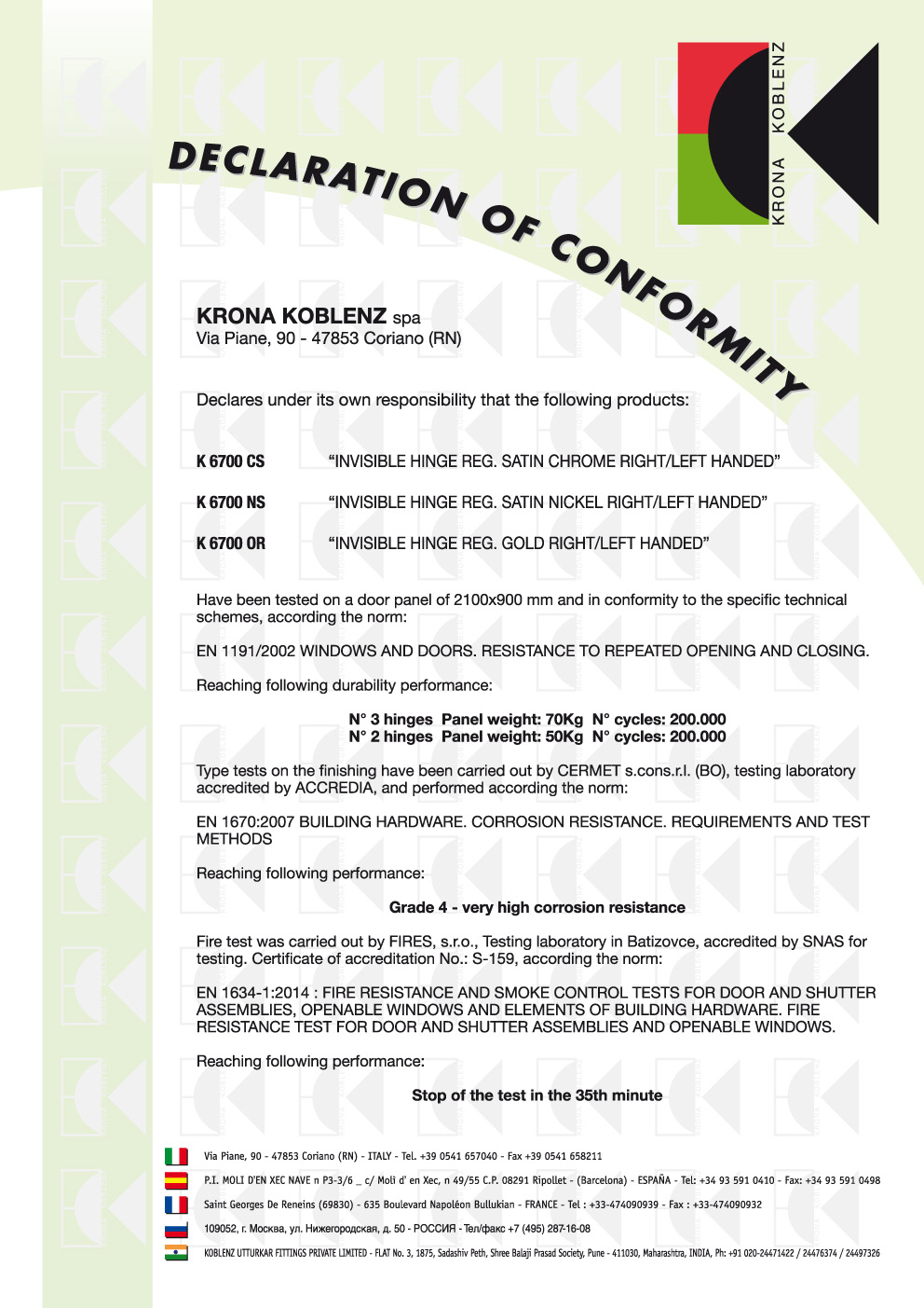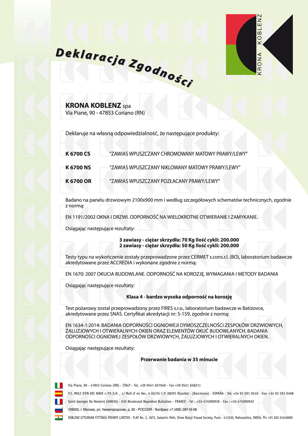 Zawias Kubica K6700 został przebadany na 30 minut odporności ogniowej co sprawia, że może być stosowany w drzwiach przeciwpożarowych i/lub dymoszczelnych. Potwierdza to raport z badań przeprowadzonych we włoskim instytucie LAPI.