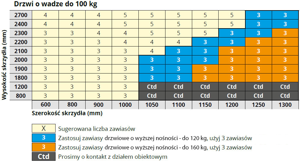 Poniższa tabela informuje o tym, ile zawiasów Exacta OT 495 o średnicy 16 mm należy zastosować na skrzydle o wadze do 100 kg w zależności od jego wysokości i szerokości.