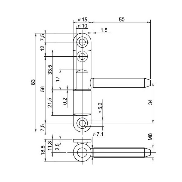 Górna część zawiasu OT P50 o średnicy 15 mm charakteryzuje się nowoczesnym, prostym oraz kompaktowym kształtem. Została wyposażona w jeden trzpień o długości 50 mm.