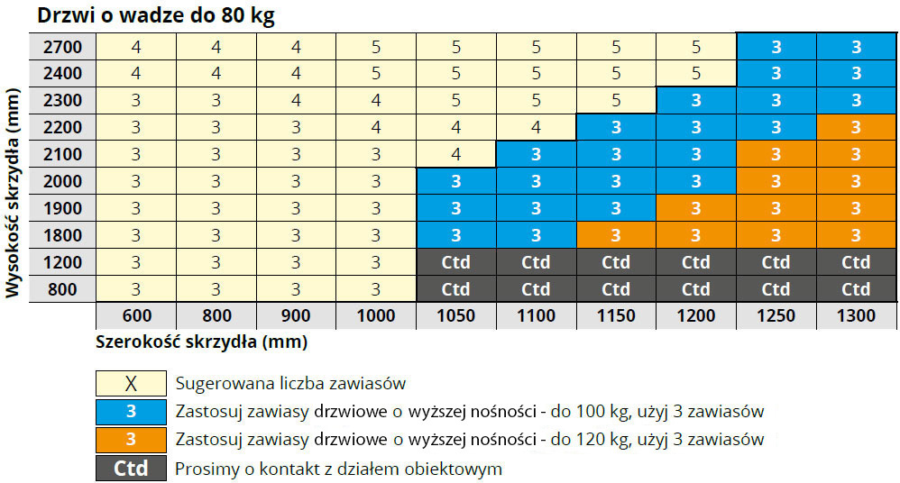 Poniższa tabela informuje o tym, ile zawiasów OT 320 o średnicy 20 mm należy zastosować na skrzydle o wadze do 80 kg w zależności od jego wysokości i szerokości.