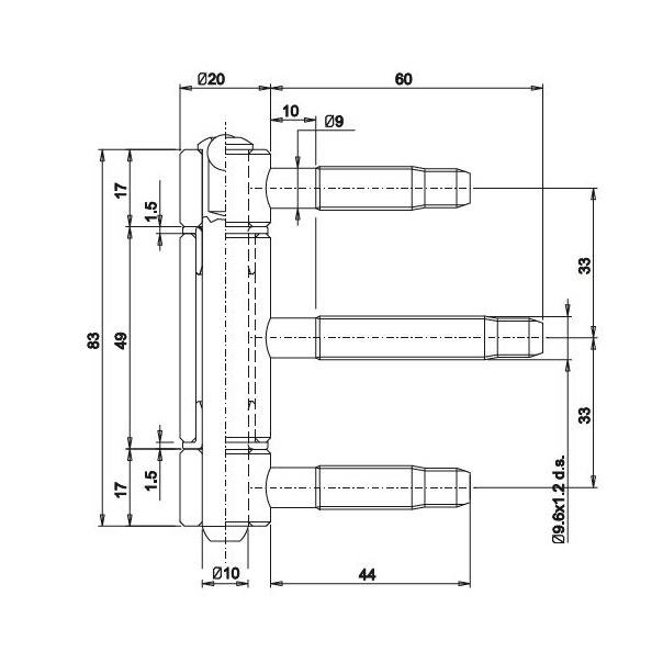 Zawias OT 320 o średnicy 20 mm charakteryzuje się nowoczesnym, prostym oraz kompaktowym kształtem. Został wykonany ze stali nierdzewnej i wyposażony w trzy trzpienie, górny i dolny o długości 44 mm oraz środkowy o długości 60 mm.