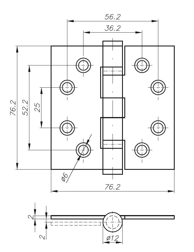 - Zawias splatany o wymiarach 76x76 mm i średnicy 12 mm.