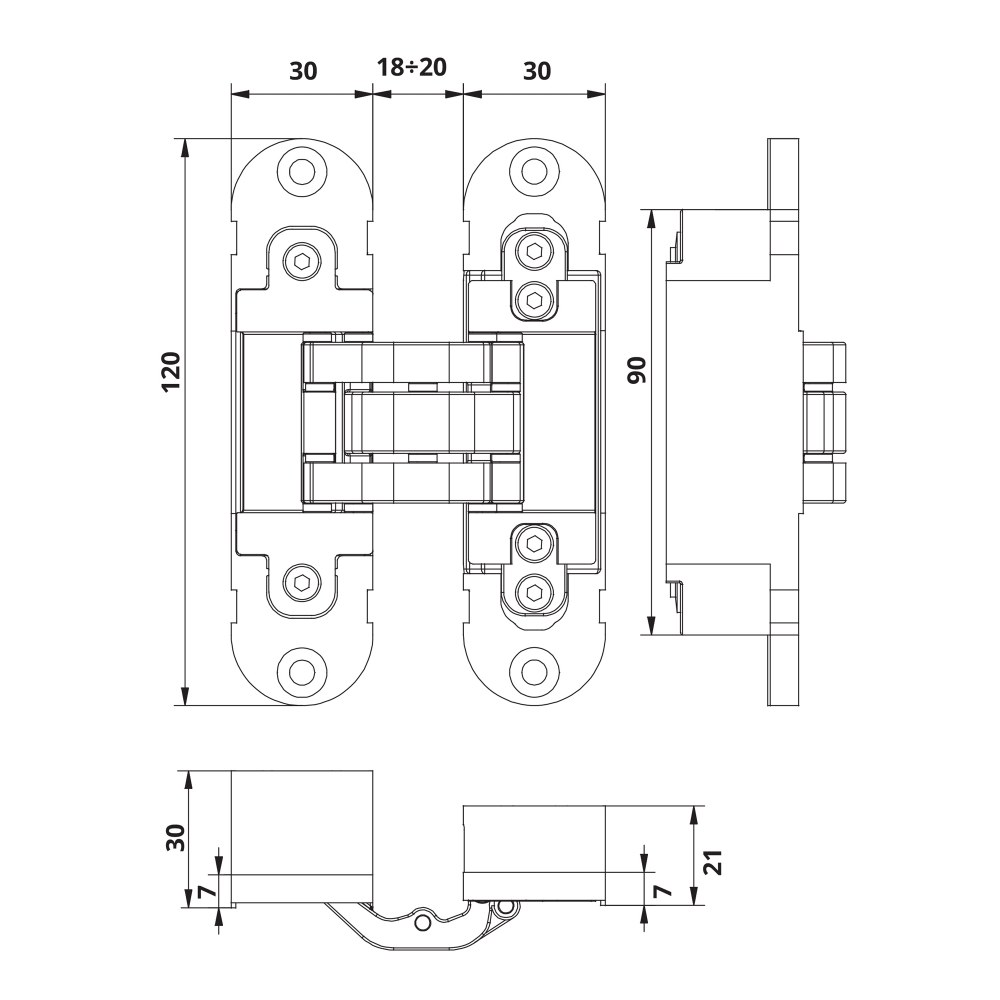 Zawias wpuszczany z możliwością regulacji położenia skrzydła w trzech płaszczyznach. Jest dedykowany do drewnianych drzwi bezprzylgowych, zamontowanych na ościeżnicy drewnianej / aluminiowej. Może być stosowany w drzwiach przeciwpożarowych. Jego trwałość została przebadana w teście obejmującym 200 000 cykli pracy. Siedem osi obrotu powoduje zmniejszone tarcie, płynny ruch ramion zawiasu oraz wpływa korzystnie na jego trwałość i nośność. Dodatkowo dzięki zastosowaniu nylonowych tulei o zwiększonej odporności na tarcie, łożyska zawiasu nie stykają się ze sobą podczas jego pracy.