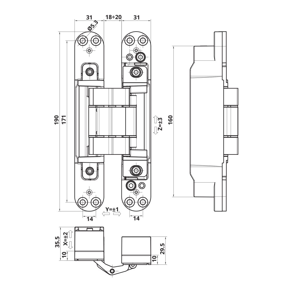 Zawias wpuszczany z możliwością regulacji położenia skrzydła w trzech płaszczyznach. Jest dedykowany do drewnianych drzwi bezprzylgowych, zamontowanych na ościeżnicy drewnianej / aluminiowej. Może być stosowany w drzwiach przeciwpożarowych. Siedem osi obrotu powoduje zmniejszone tarcie, płynny ruch ramion zawiasu oraz wpływa korzystnie na jego trwałość i nośność. Dodatkowo dzięki zastosowaniu nylonowych tulei o zwiększonej odporności na tarcie, łożyska zawiasu nie stykają się ze sobą podczas jego pracy. Zawias jest dostarczany wraz z czterema dedykowanymi nasadkami.