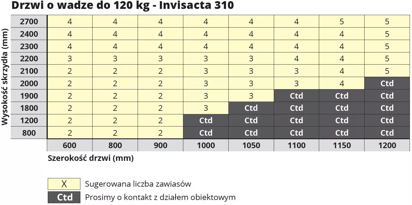 Poniższa tabela informuje o tym, ile zawiasów Invisacta 310 należy zastosować na skrzydle o wadze do 120 kg w zależności od jego wysokości i szerokości.