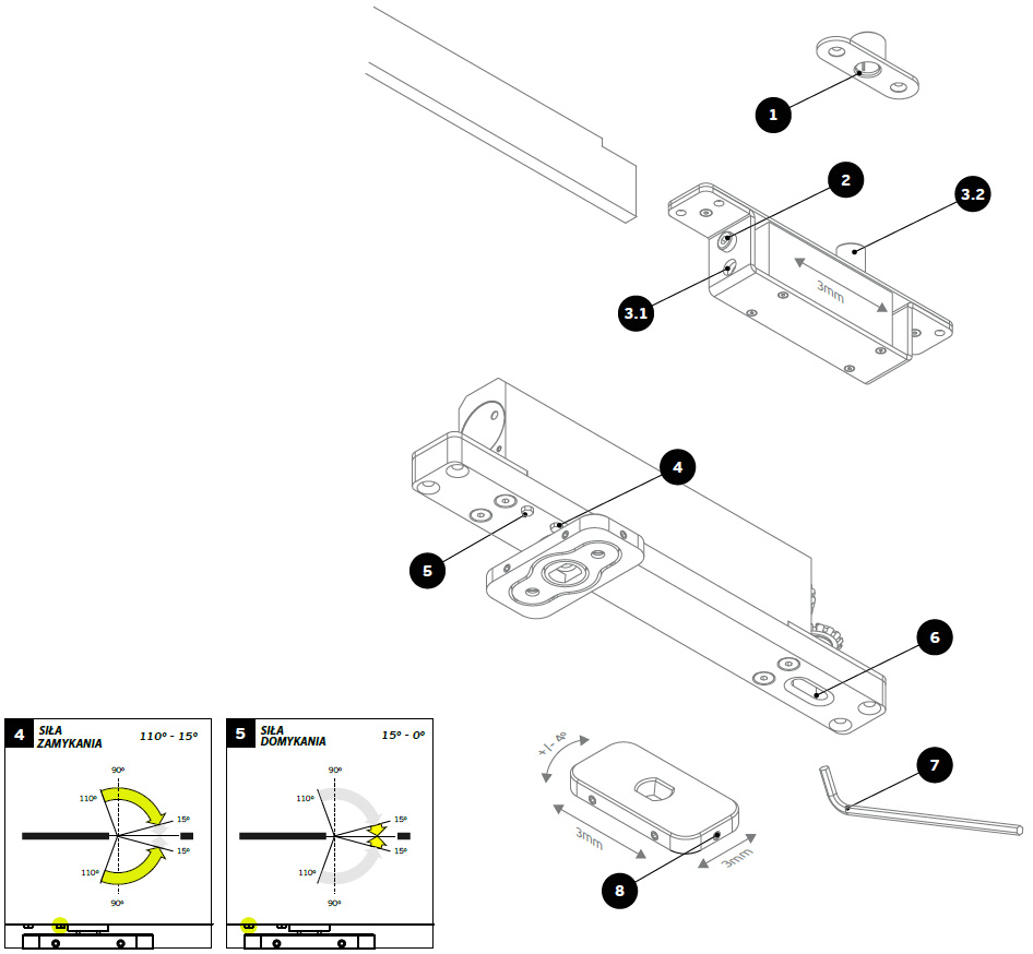 3.1 - Unoszony wałek ułatwiający montaż oraz zapewniający perfekcyjne działanie podczas ruchu obrotowego drzwi.