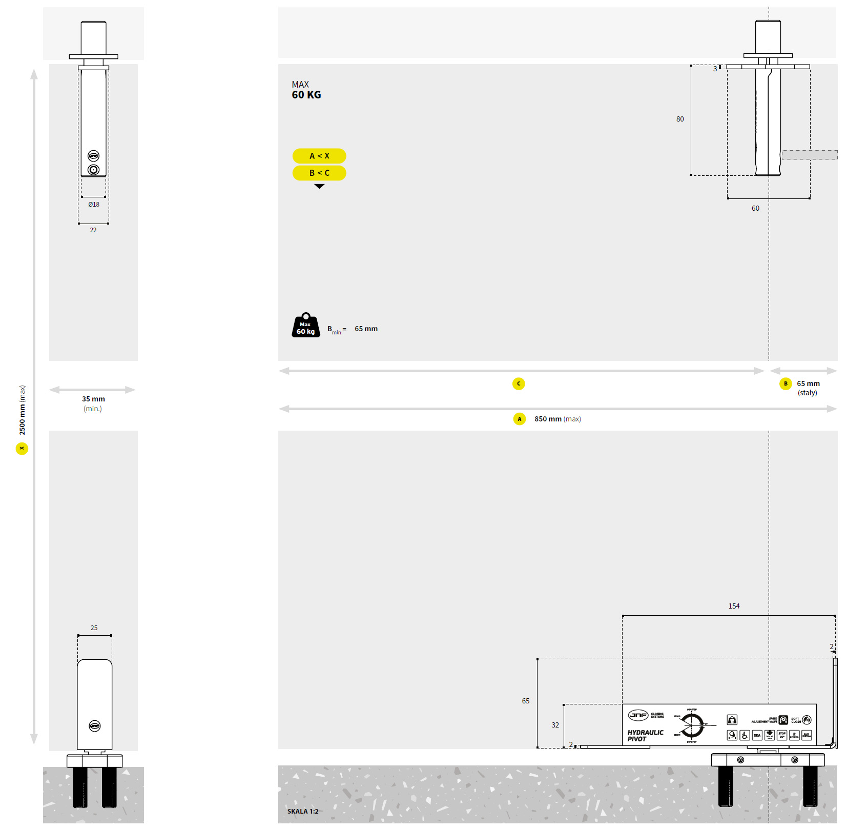 Zawias hydrauliczny z mechanizmem krzywkowym do drzwi typu pivot o maksymalnej wadze 60 kg i minimalnej grubości skrzydła 35 mm. Wykonany ze stali nierdzewnej AISI 304. Posiada regulację szybkości zamykania za pomocą śruby oraz oferuje mechanizm Soft Close, zapewniający łagodne domykanie skrzydła. Dolną część zawiasu należy zawsze montować na krawędzi skrzydła. Z kolei w przypadku górnej części zawiasu, odległość jego osi od krawędzi skrzydła jest stała i wynosi 65 mm.
