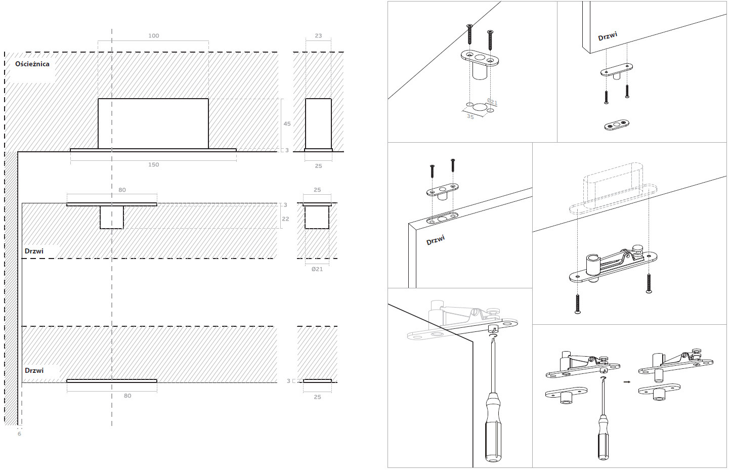 Poniższe ilustracje i rysunki techniczne przedstawiają budowę oraz sposób montażu zawiasu.