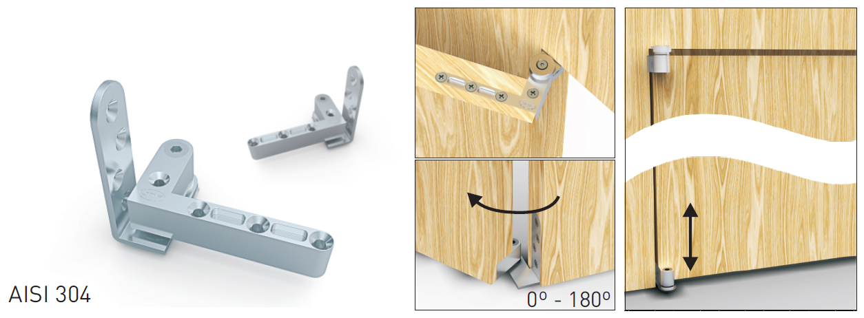 Jednokierunkowy zawias składający się z części górnej i części dolnej. Wykonany ze stali nierdzewnej AISI 304 i dostępny w wykończeniu PVD w kolorze czarnym. Odpowiedni do zastosowania w drzwiach drewnianych typu pivot o maksymalnej wadze 40 kg i grubości skrzydła 35-45 mm.