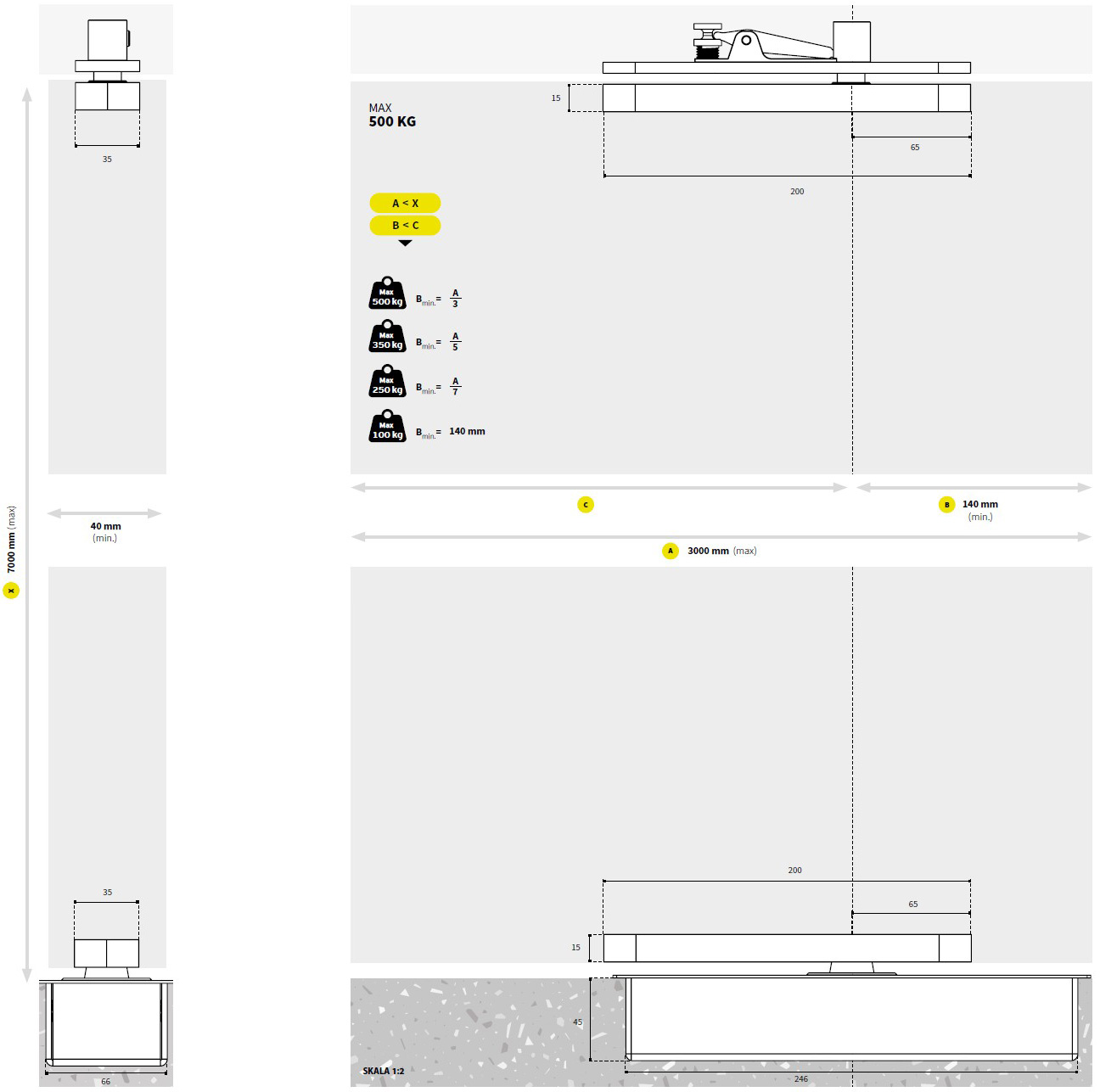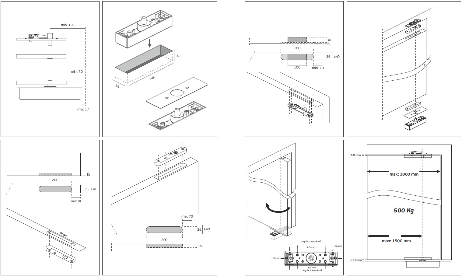 W górnej części zawiasu odległość od osi zawiasu do krawędzi skrzydła musi wynosić co najmniej 140 mm. Montaż dolnej części zawiasu do podłoża nie wymaga wykonywania prac murarskich, co znacznie ułatwia i przyspiesza instalację drzwi typu pivot. Zarówno górna, jak i dolna część zawiasu umożliwia regulację położenia skrzydła, zapewniając jego dokładne wypoziomowanie i wyrównanie podczas instalacji.