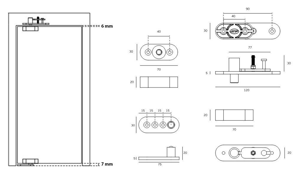 Poniższe rysunki przedstawiają elementy, z których składa się część górna oraz część dolna zawiasu. Wymiary górnej szczeliny wynoszą 6 mm, a dolnej szczeliny 7 mm.